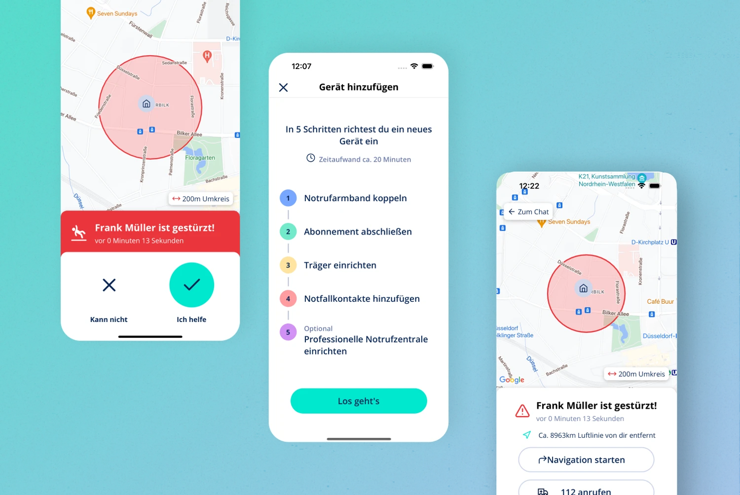 Im Ernstfall bleibt keine Zeit für Navigation. Der Notruf musste sofort auslösen, Kontakte informieren und relevante Informationen bereitstellen. Klar, strukturiert, verständlich