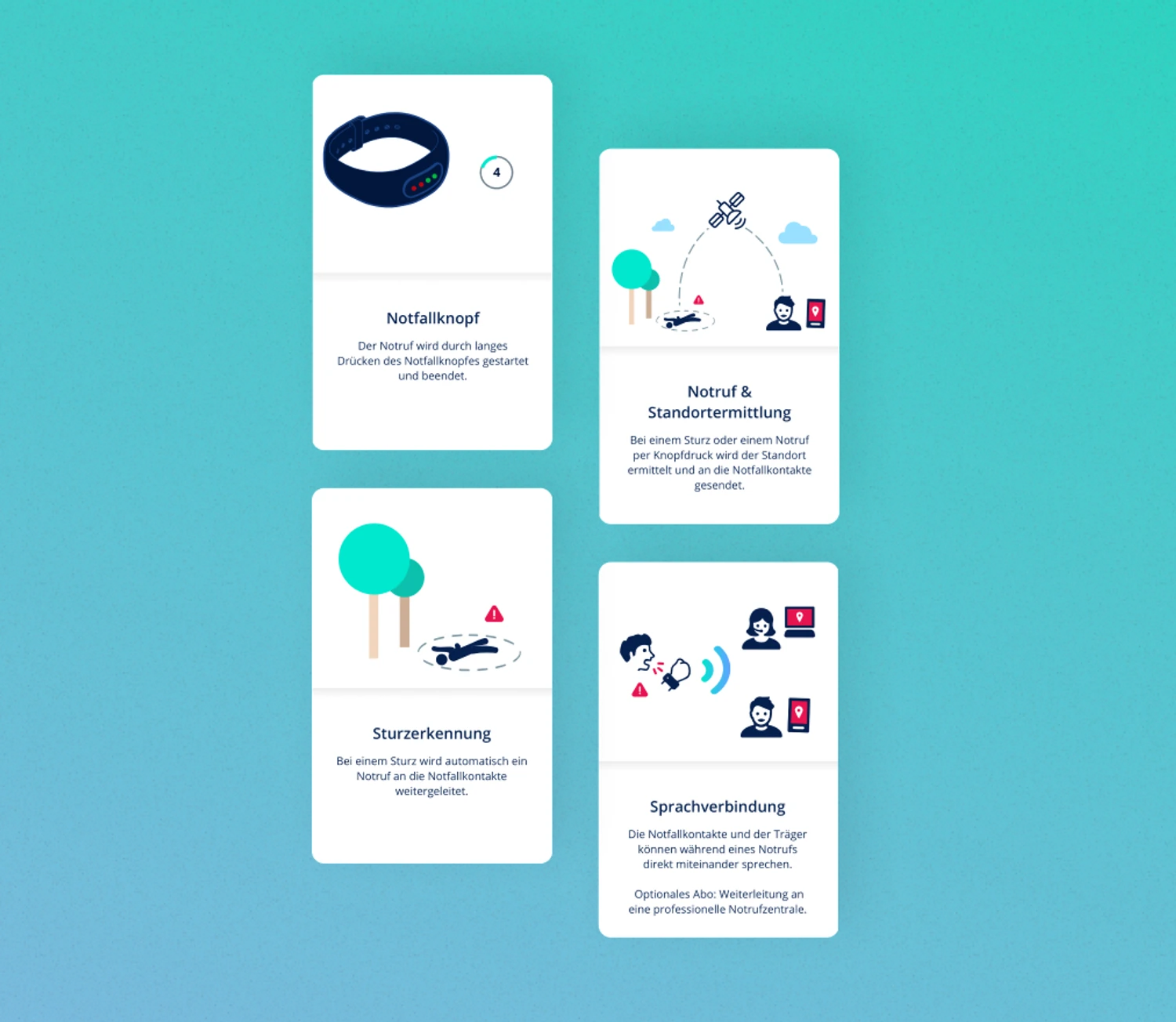 Das Armband löst aus, die App übernimmt. Notruf starten, Informationen bündeln, Kontakte informieren. Ohne Umwege. Gebaut für wichtige Momente.